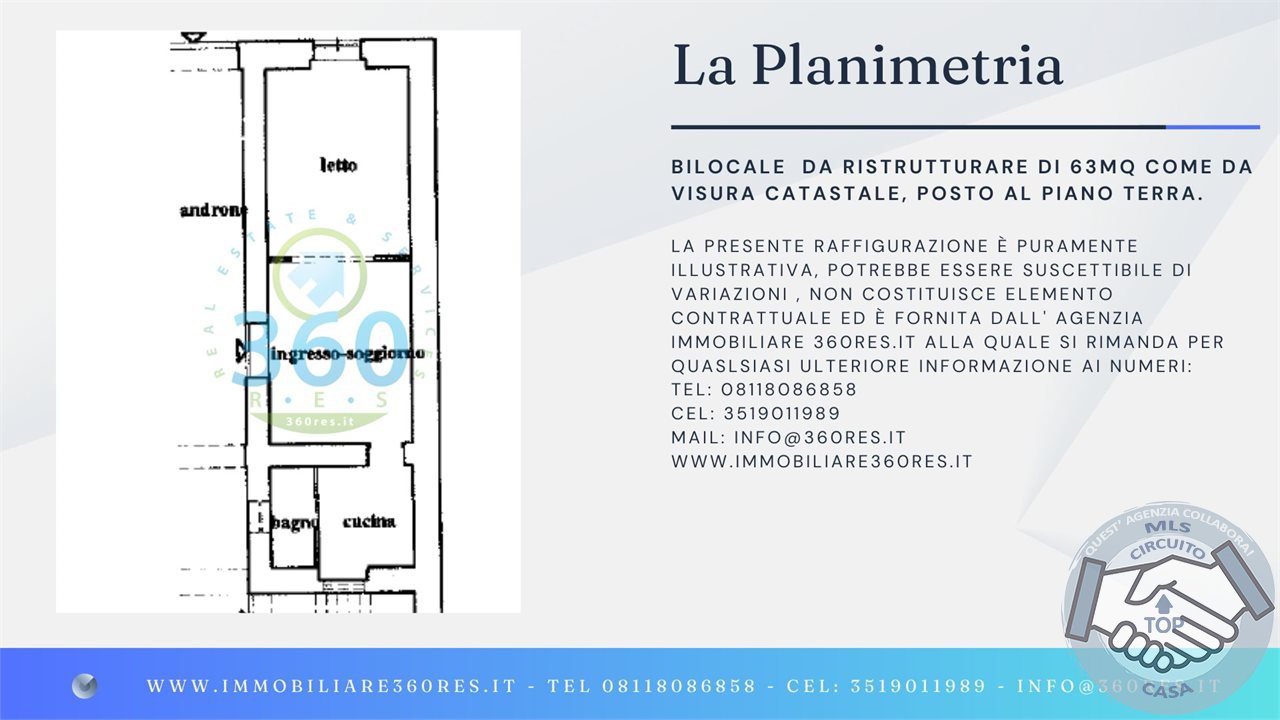Proponiamo in vendita un bilocale da ristrutturare di 63 mq (come da categoria catastale), situato al piano terra all'interno di un mini condominio,