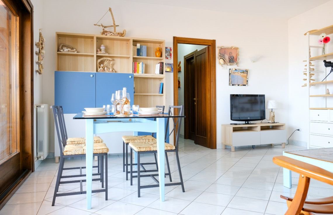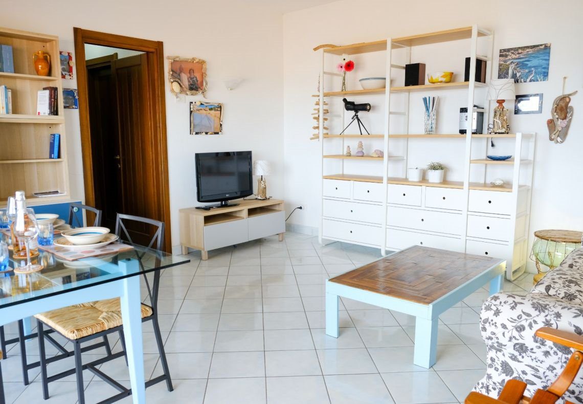 Il luminoso soggiorno, che affaccia sul terrazzo di mq 25 tramite un'ampia parete vetrata, ha un arredo nuovo e moderno ed è dotato di divano letto.