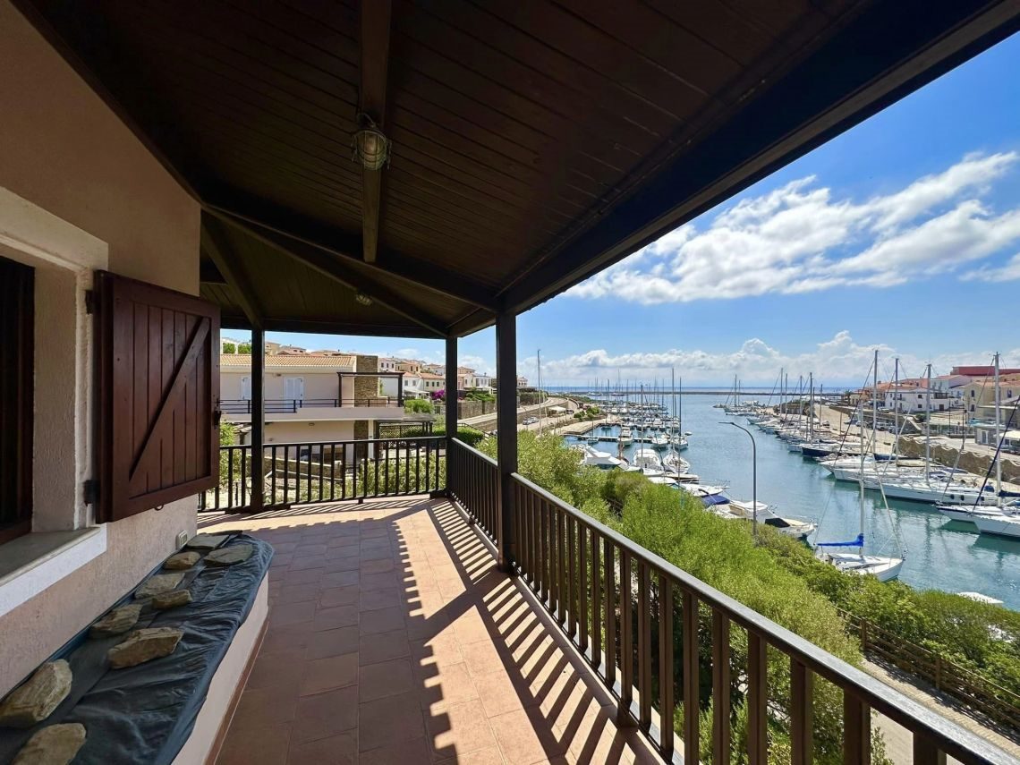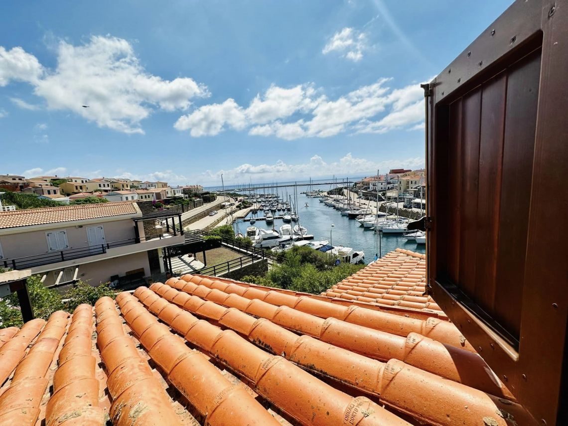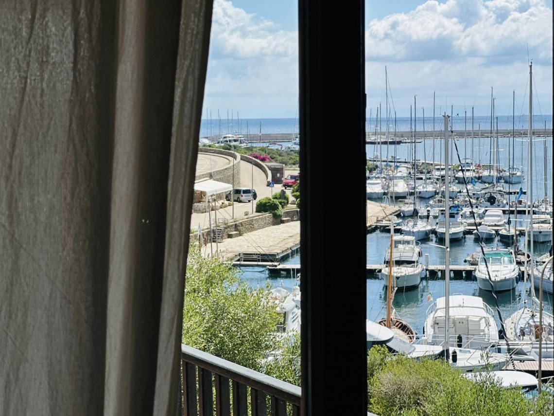 piano primo con un luminosissimo living con soggiorno e cucina abitabile che si affacciano sulla terrazza coperta di mq 30 con incantevole vista mare sul porto e sul villaggio, una camera matrimoniale, un disimpegno e il bagno.