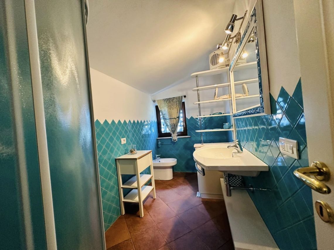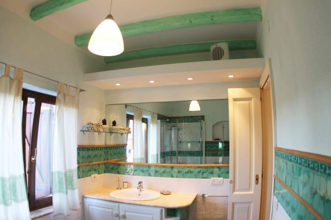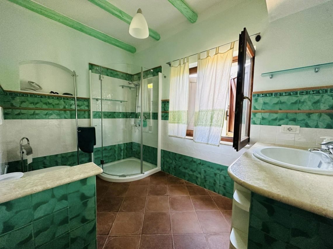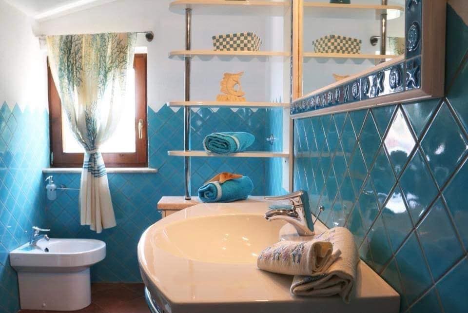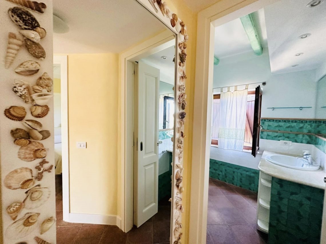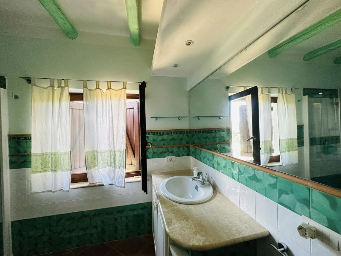 I rivestimenti in ceramica sarda, tipica e smaltata , sia dei bagni che della cucina, il marmo di Orosei utilizzato sia nel top mobile cucina, top mobile lavabo bagno, davanzali, soglie, e alzate scale e gradini interni conferiscono quella tipicità dello stile esclusivo mediterraneo sardo.
