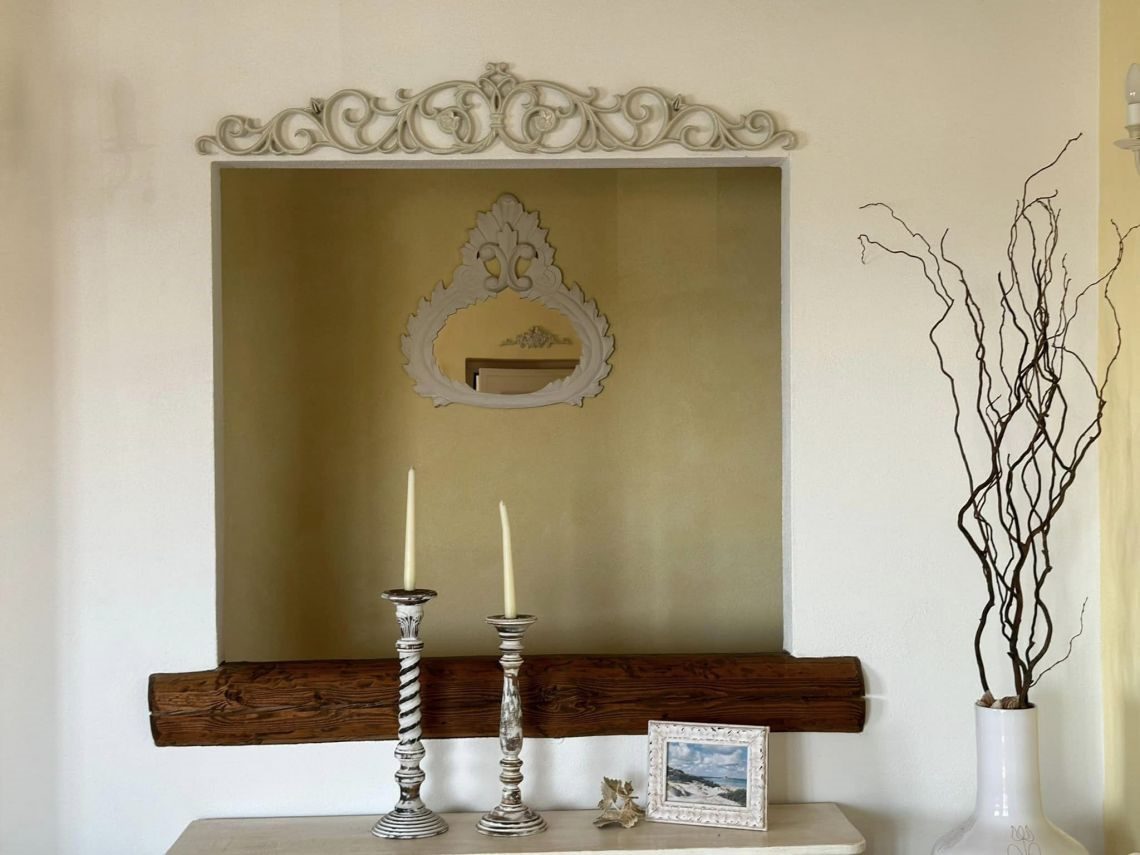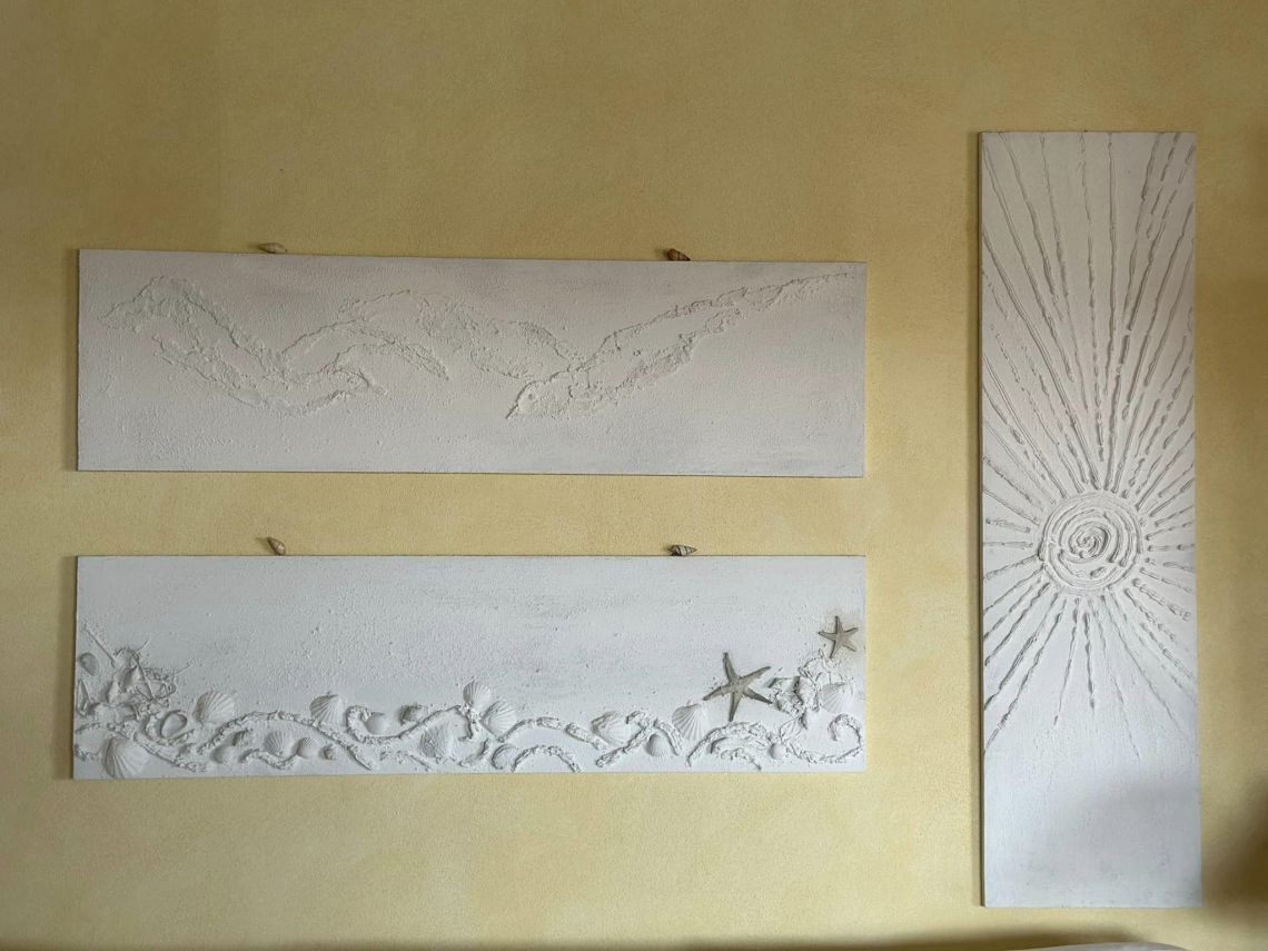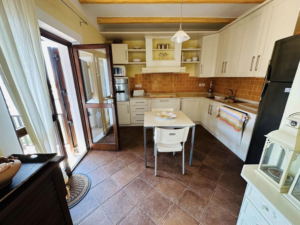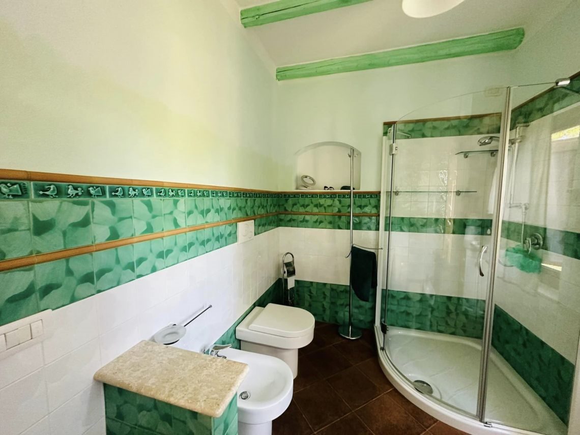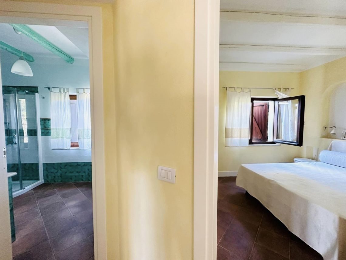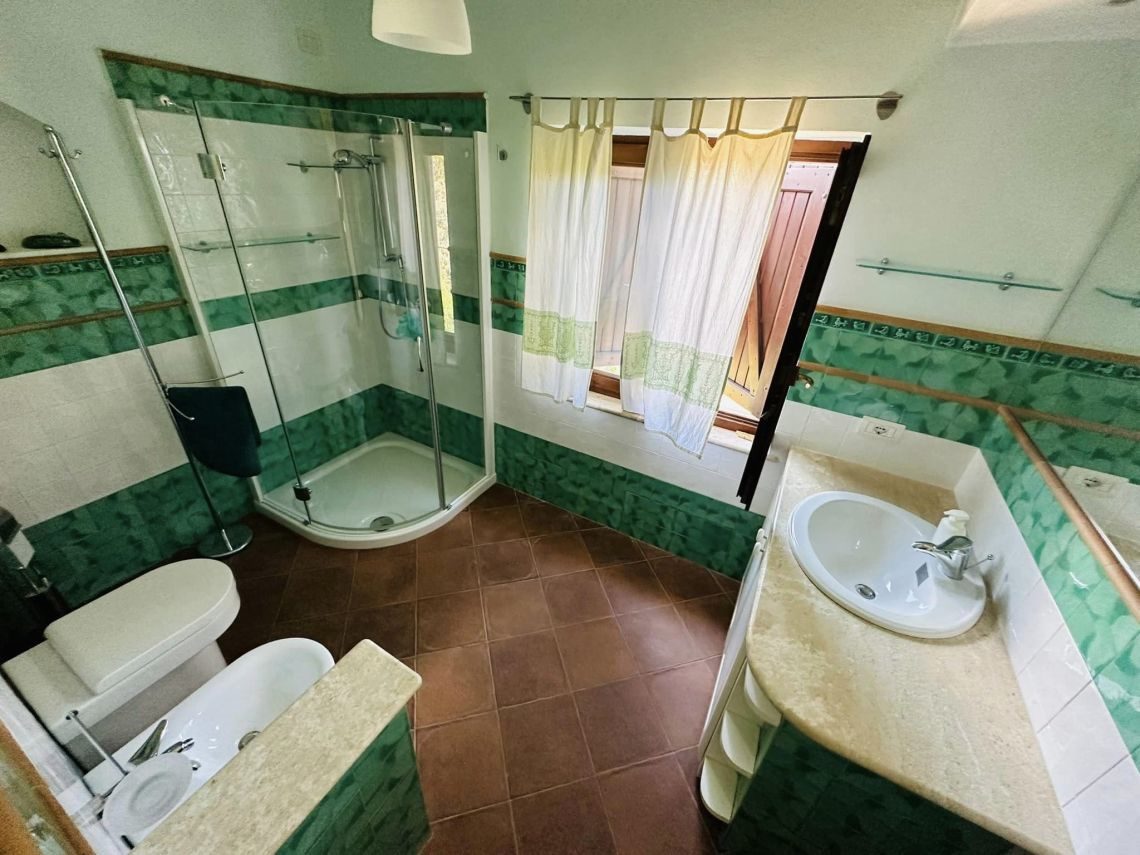I rivestimenti in ceramica sarda, tipica e smaltata , sia dei bagni che della cucina, il marmo di Orosei utilizzato sia nel top mobile cucina, top mobile lavabo bagno, davanzali, soglie, e alzate scale e gradini interni conferiscono quella tipicità dello stile esclusivo mediterraneo sardo.