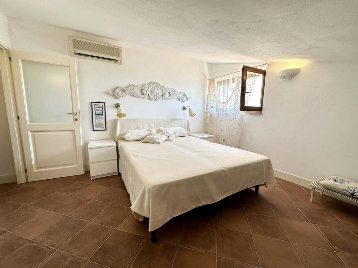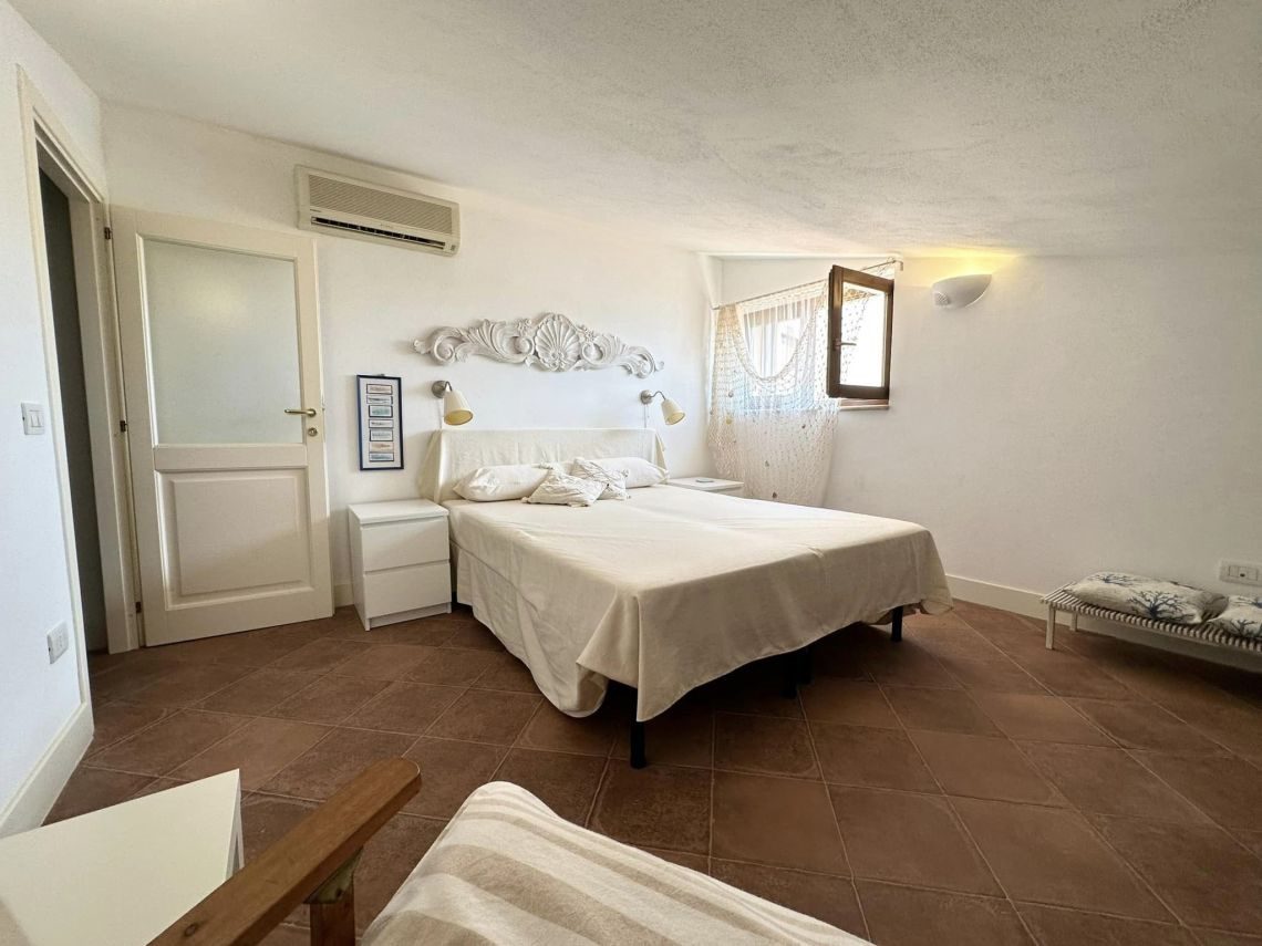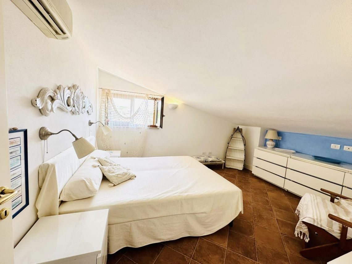 Al piano intermedio troviamo un disimpegno/ripostiglio, una cabina armadi ed un balcone di mq 5 con vista del paese e del porticciolo.