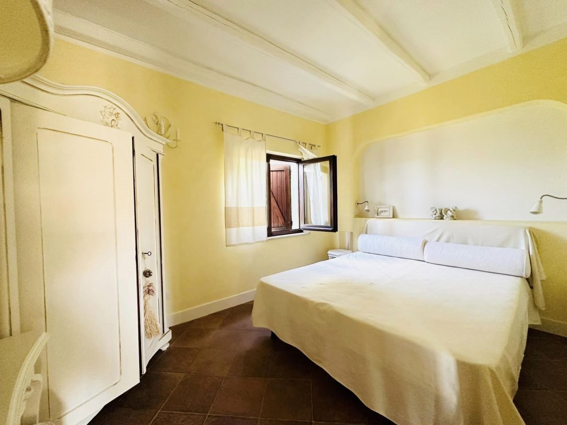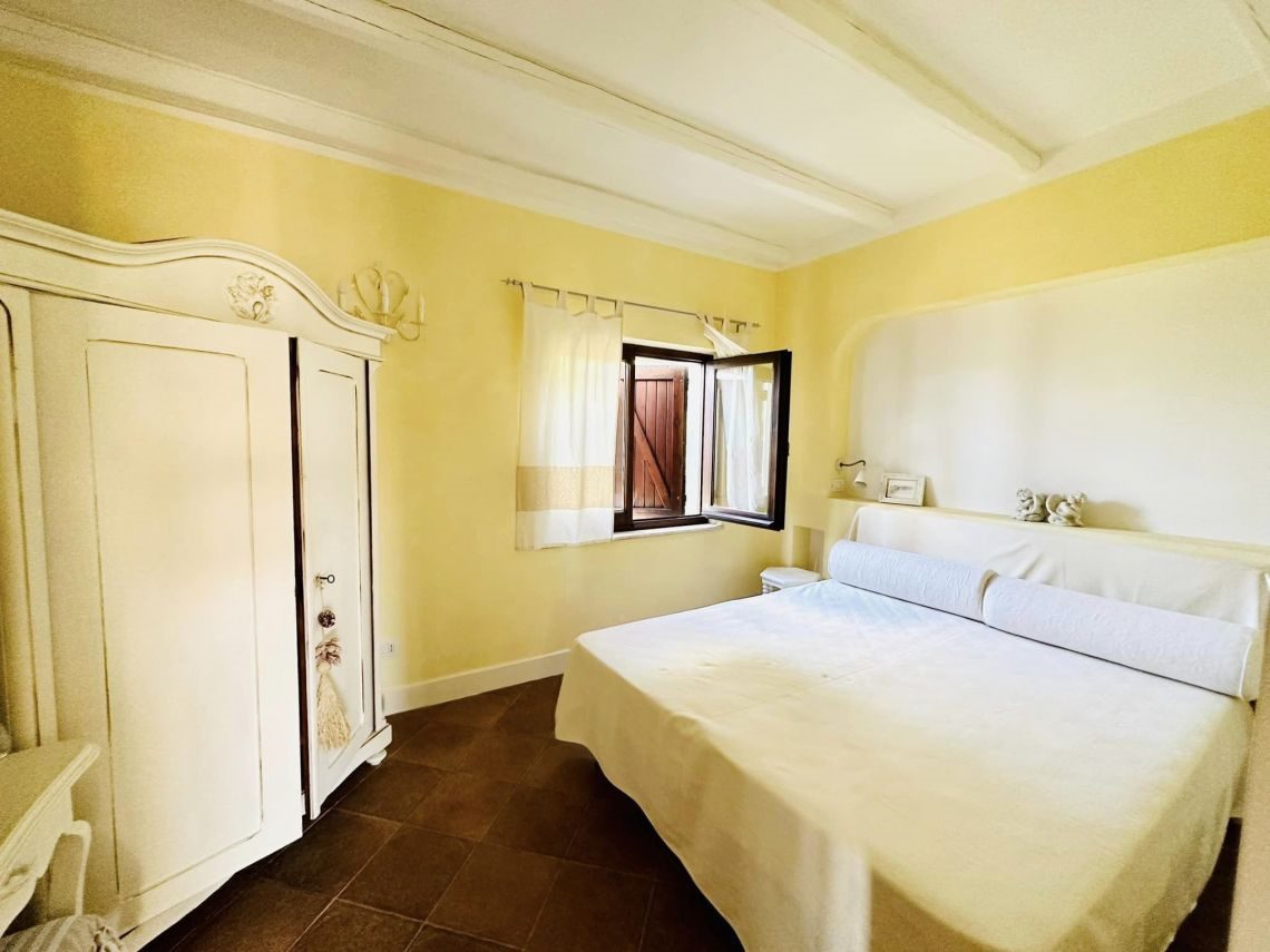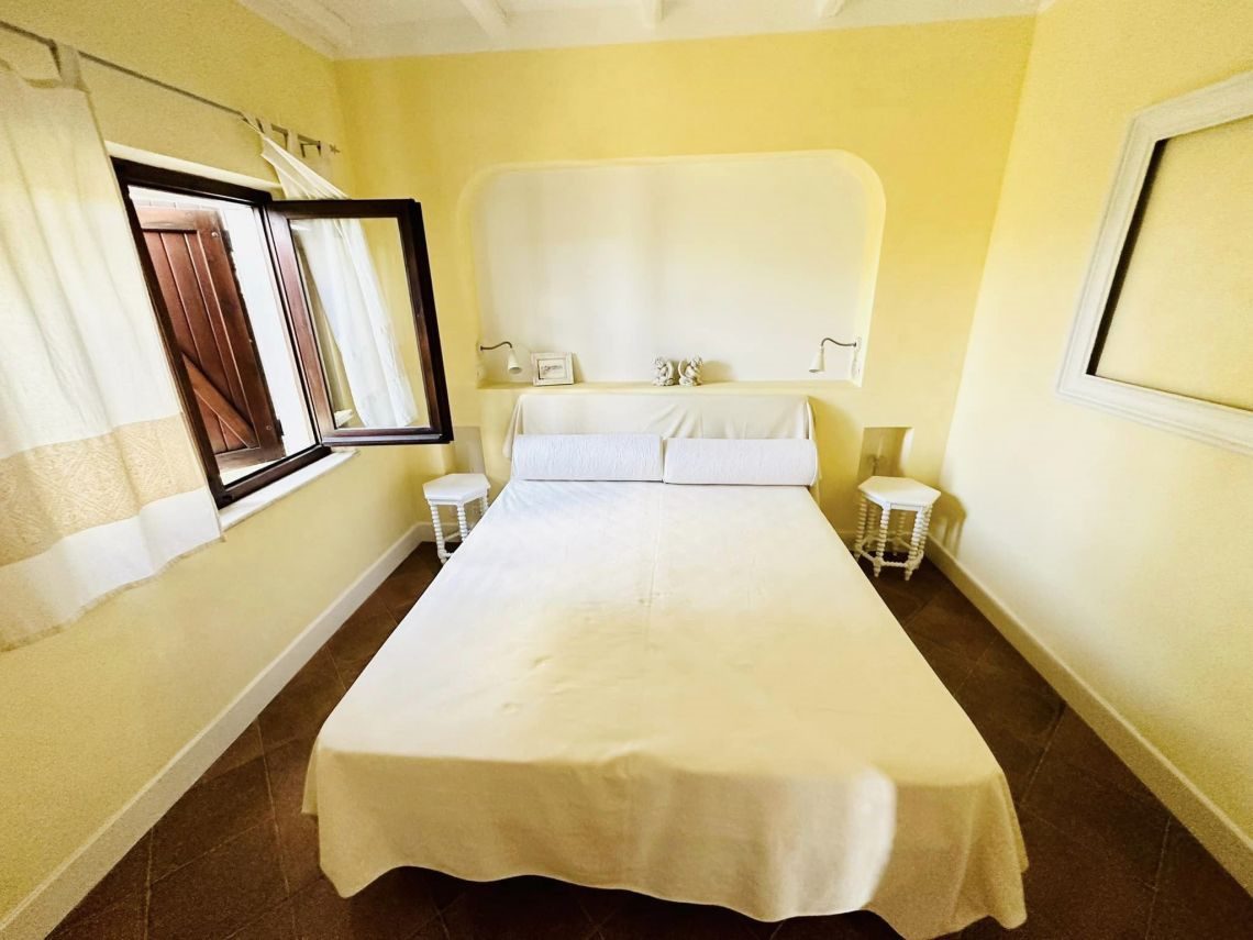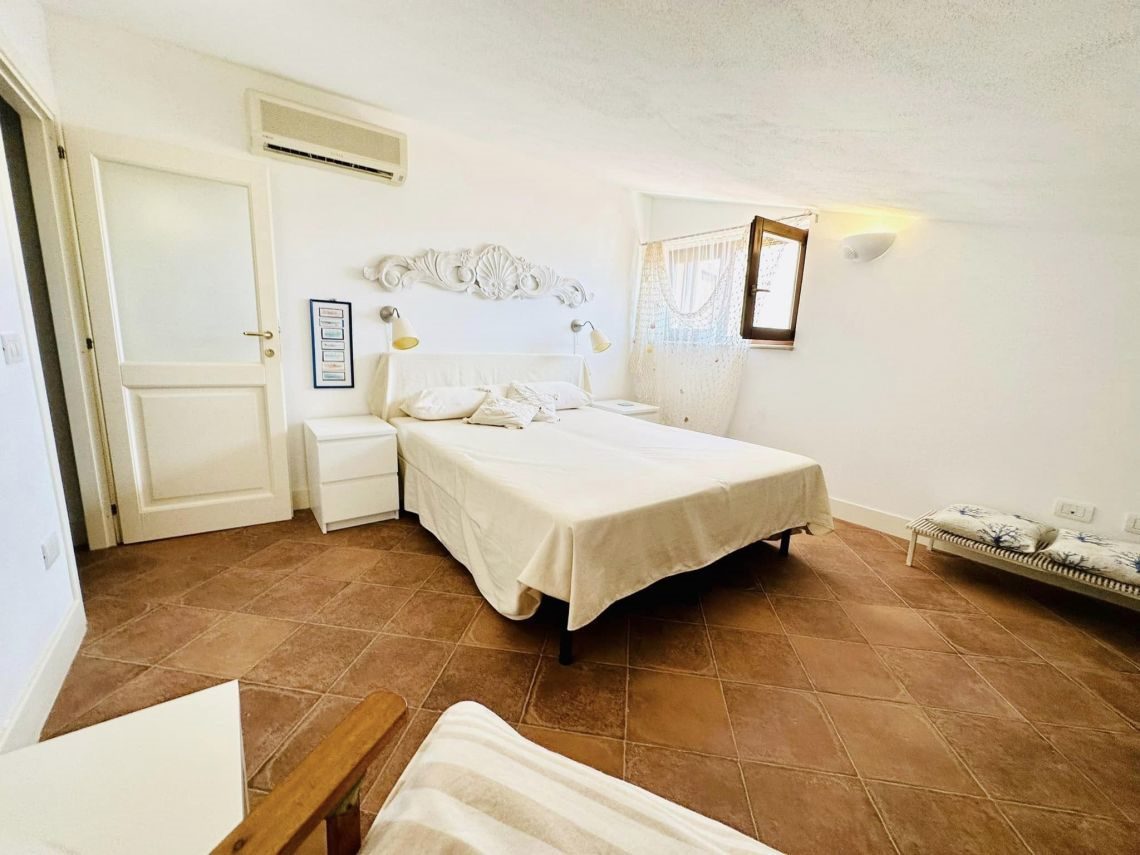 Al piano intermedio troviamo un disimpegno/ripostiglio, una cabina armadi ed un balcone di mq 5 con vista del paese e del porticciolo.