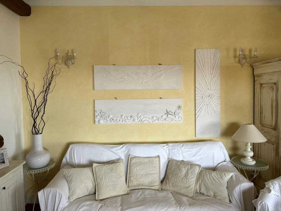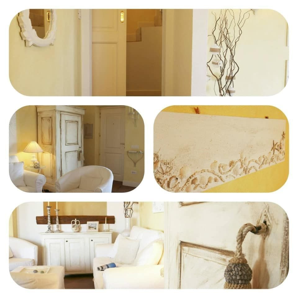 A completare il tutto, la scelta di colori chiari e tenui delle pareti, arredamenti, porte interne bianche (legno laccate) con il contrasto, ma raffinato, soffitto con travi in legno a vista che aggiungono calore e tipicità a tutto l'ambiente.