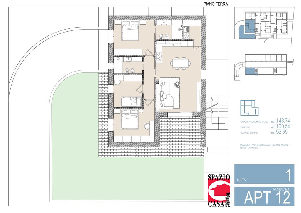 Spazioso quadrilocale con ampio giardino ad angolo, inserito in una moderna palazzina in fase di realizzazione. L'appartamento presenta una zona giorno di generose dimensioni, con affaccio sul portico vivibile, zona cottura/pranzo servite da dispensa/lavanderia; corridoio in zona notte, tre camere da letto, delle quali due matrimoniali (una con bagno padronale) e secondo bagno. Al primo interrato autorimessa doppia, d'oltre 50 metri quadri. Possibilità di progettazione degli interni seguita da un'arredatrice. Previste finiture di alta qualità, con riscaldamento e raffrescamento a pavimento, VMC, serramenti con tripli vetri, scelte ampissime tra vari gres o parquet, videocitofono, fotovoltaico, ecc. - Maggiori Dettagli: Porta blindata, Insonorizzazione, Predisposizione antifurto, Video citofono, Portico, Climatizzato