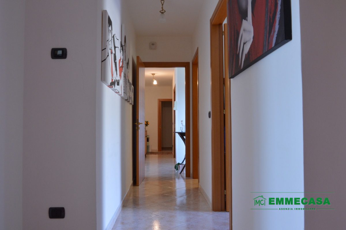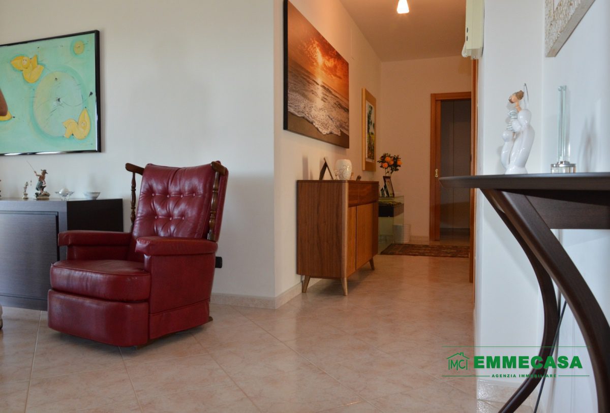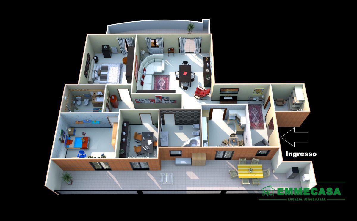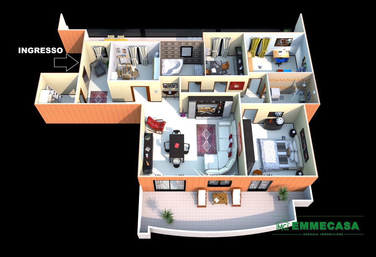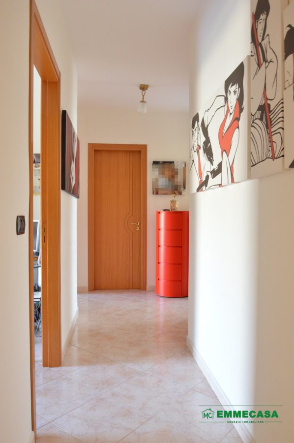 La magione, dalle metrature importanti, è situata al piano intermedio in stabile con ascensore, copre una superficie di 135. mq.e si sviluppa al suo interno come segue. Dalla porta d'ingresso si accede ad un grazioso disimpegno che apre sul grande salone a vista ed alla cucina abitabile. Un ulteriore disimpegno separa la zona giorno dalla zona notte dove vi sono la camera matrimoniale, due camerette, bagno padronale con vasca a spicchio e bagno di servizio. L'appartamento ha doppia esposizione, è munito di comodo ripostiglio e di due ampi balconi di 66 mq. complessivi entrambi con tende da sole. L'interno si presenta in ottimo stato, la porta d'ingresso è blindata, il pavimento è in ceramica, gli infissi sono in vetrocamera, vi sono le zanzariere, il videocitofono e la predisposizione per l'impianto di allarme. € 195.000 Possibilità di box auto 25 mq. € 20.000,00