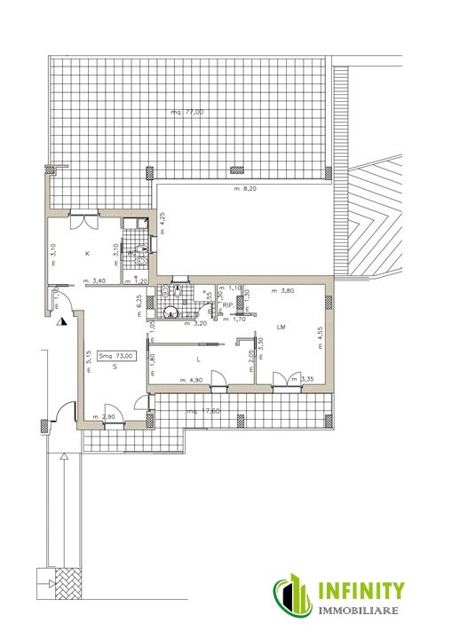 L'appartamento, di mq 73 con un terrazzo di oltre 77 mq, è ubicato all'interno di una struttura pensata e realizzata con elementi che garantiscono adeguati coefficienti energetici.