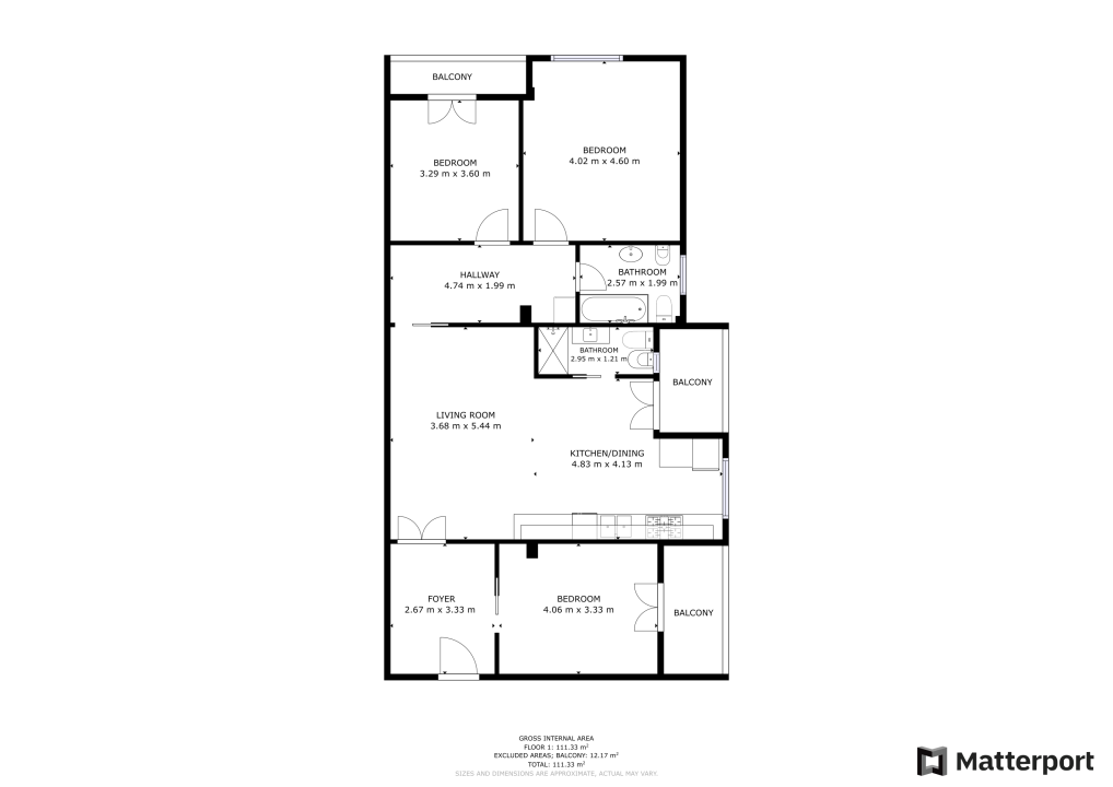 L'appartamento ha una superficie interna di circa 110 mq oltre a circa 15 mq di spazi esterni suddivisi in 3 balconi.