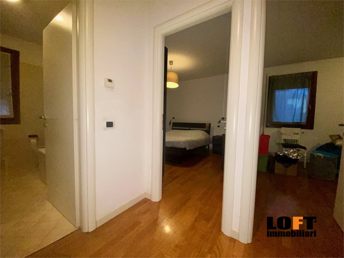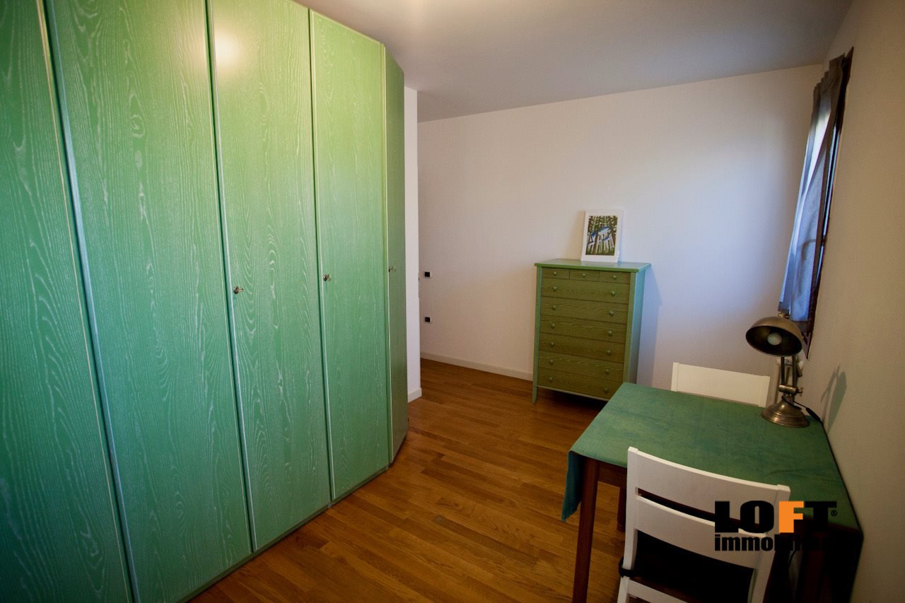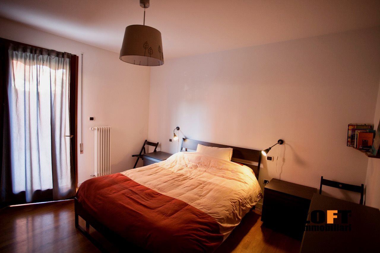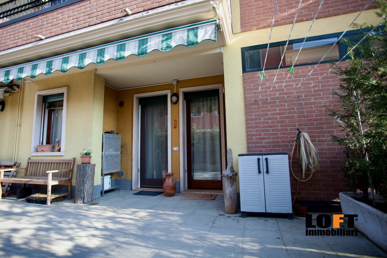 L'ingresso conduce direttamente nel piacevole soggiorno open space con cucina a vista ed accesso diretto alla loggia che dà sul giardino privato, ideale per pranzi e cene all'aperto o momenti di relax. Nel cortile privato si trova una comoda casetta per gli attrezzi.