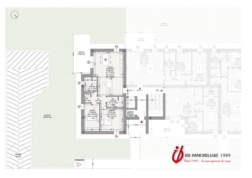 Soggiorno/cucina, doppi servizi, ripostiglio, camera matrimoniale di mq 15 circa ed una singola di mq 11,30 circa, ampio porticato di mq 19 circa, ampio giardino di mq 256 circa, Completano la proprietà,al piano interrato, doppio garage in larghezza ed una cantina. Finiture di pregio.