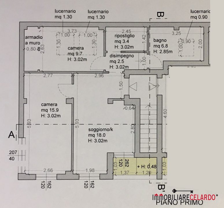 soggiorno/pranzo con angolo cottura e balcone, una camera matrimoniale, una singola con lucernari, bagno e ripostiglio.