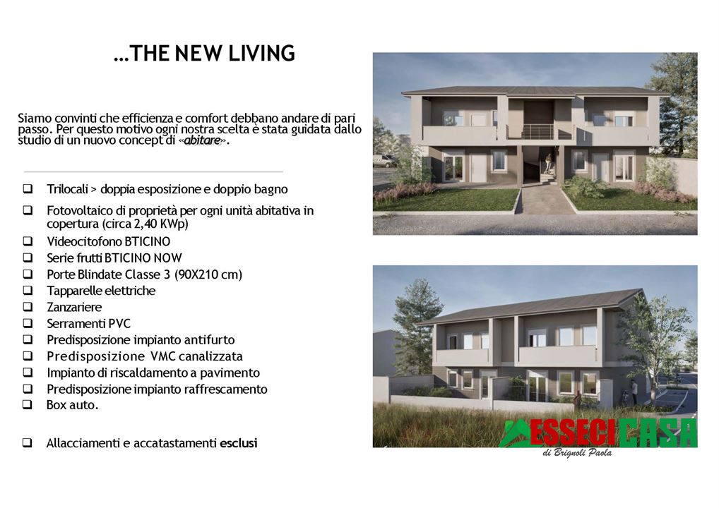 Casirate d'Adda - In contesto residenziale tranquillo, proponiamo trilocale in classe energetica A all'interno di palazzina di nuova costruzione di sole 4 unità. L'appartamento, già realizzato e personalizzabile nelle finiture, è posto al piano terra con ingresso indipendente e composto da: soggiorno con angolo cottura e accesso diretto al portico, disimpegno, due camere da letto, doppi servizi e giardino privato . Completa la proprietà un ampio box. Riscaldamento autonomo a pavimento con pompa di calore, Pannelli fotovoltaici di proprietà (2,4 kWp), Serramenti PVC con zanzariere e tapparelle elettriche in alluminio. Predisposizioni raffrescamento, VMC e antifurto. Possibilità di visionare l'immobile previo appuntamento.