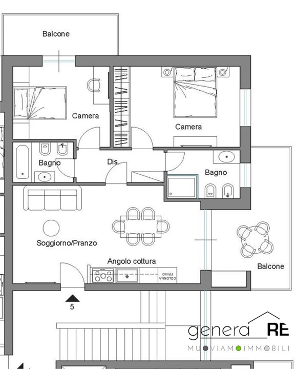 L'appartamento è un trilocale posto al primo piano è così composto: salone con cucina a vista, disimpegno, due camere, due bagni, due ampi balconi.