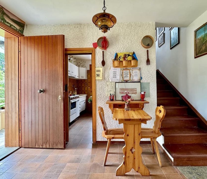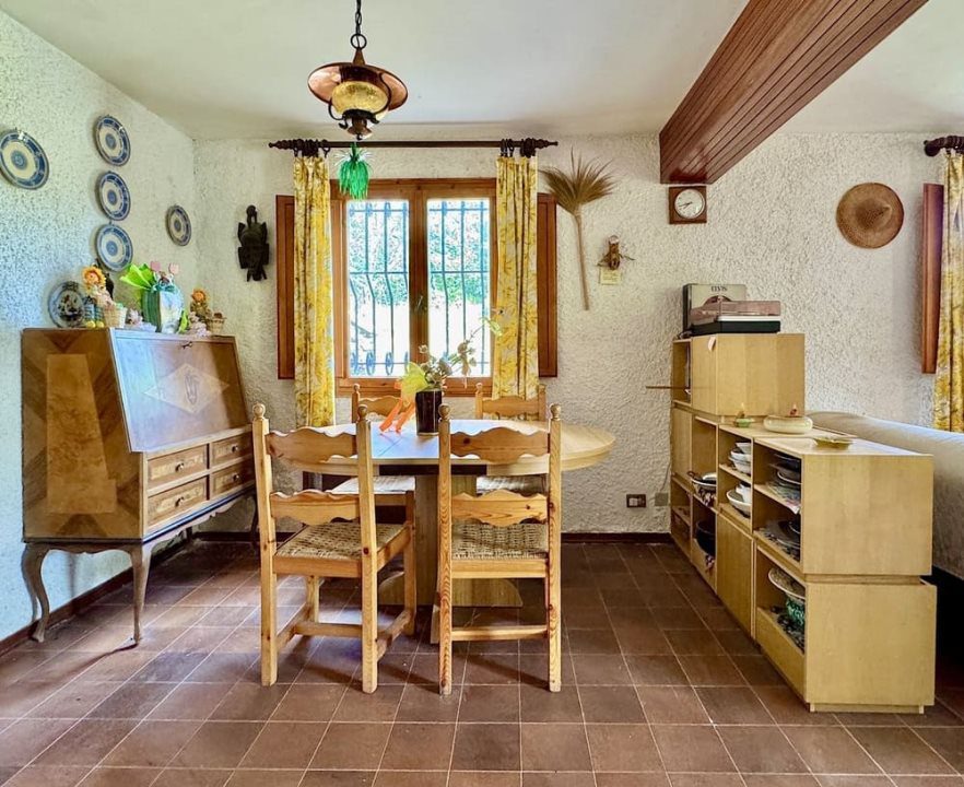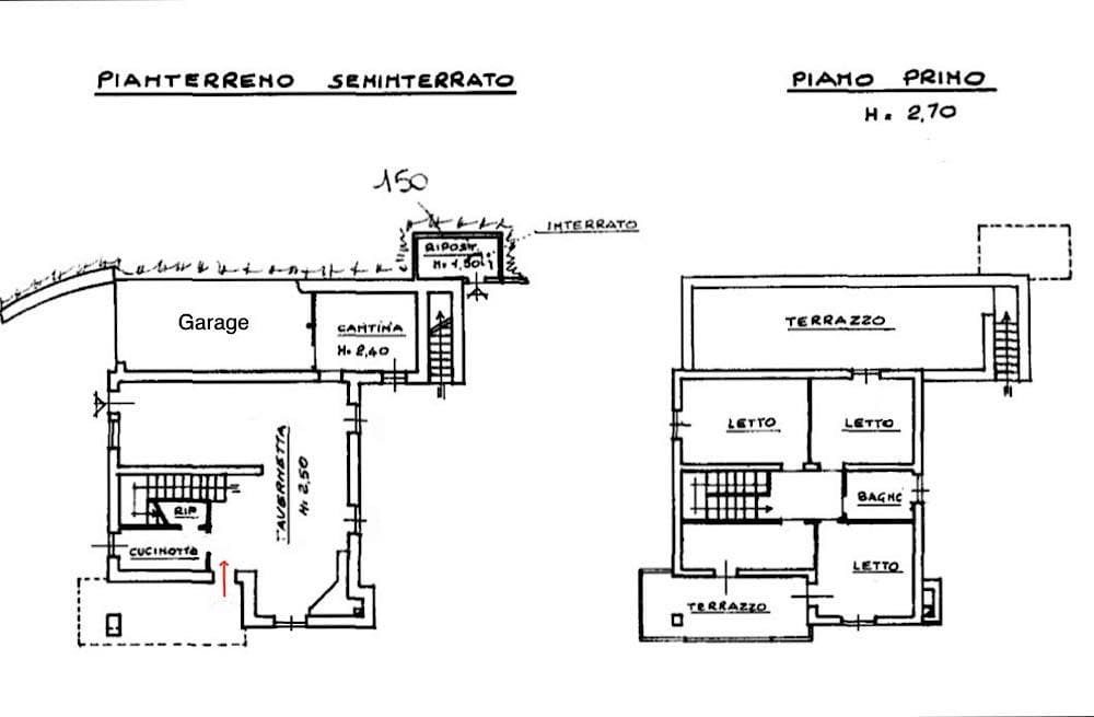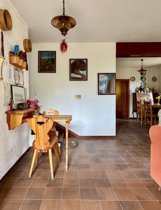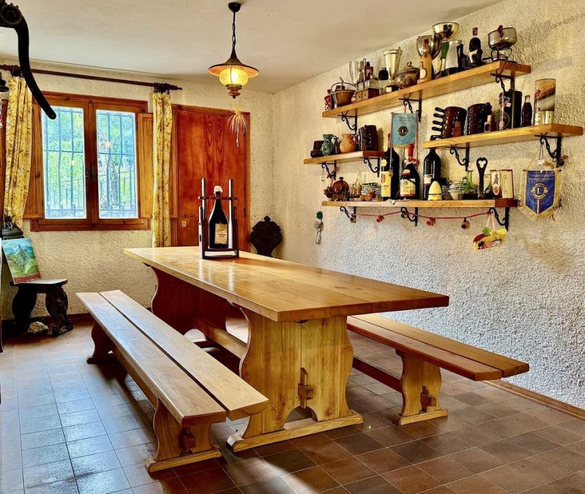 Piano Terra - Cucinotto, ampia taverna arredata come un salotto con camino e tavolo da pranzo in legno massello da 12 persone, cantina, bagno, portico e garage