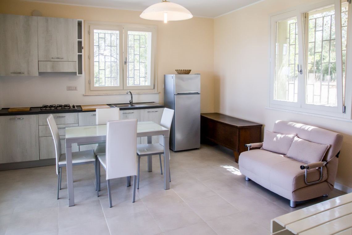 Nell'abitazione principale l'ingresso si affaccia su un ampio soggiorno con cucina a vista e tipico camino del 1748. A seguire ci sono un bagno/lavanderia, un secondo bagno con box doccia nella zona notte, una camera singola e tre camere matrimoniali.