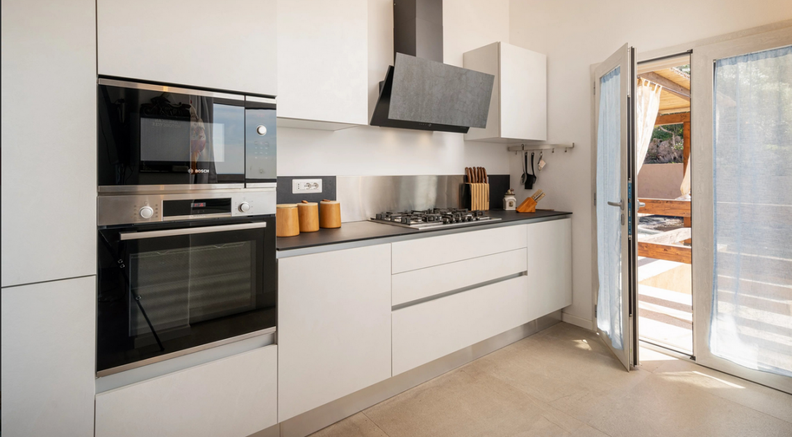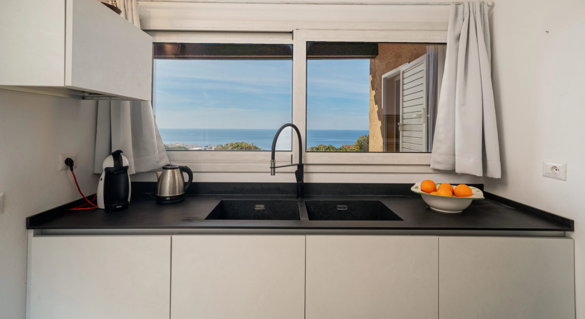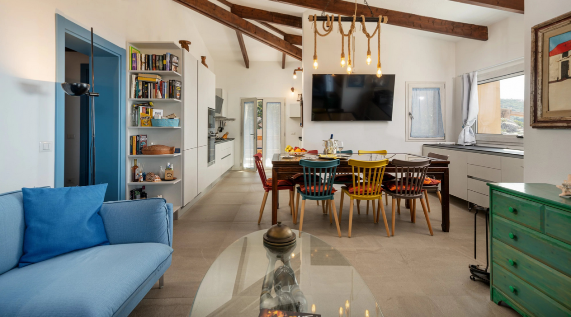 La solare villa è disposta su due piani e comprende un'accogliente e luminosa zona living con ampie finestre da cui godere della splendida vista mare.