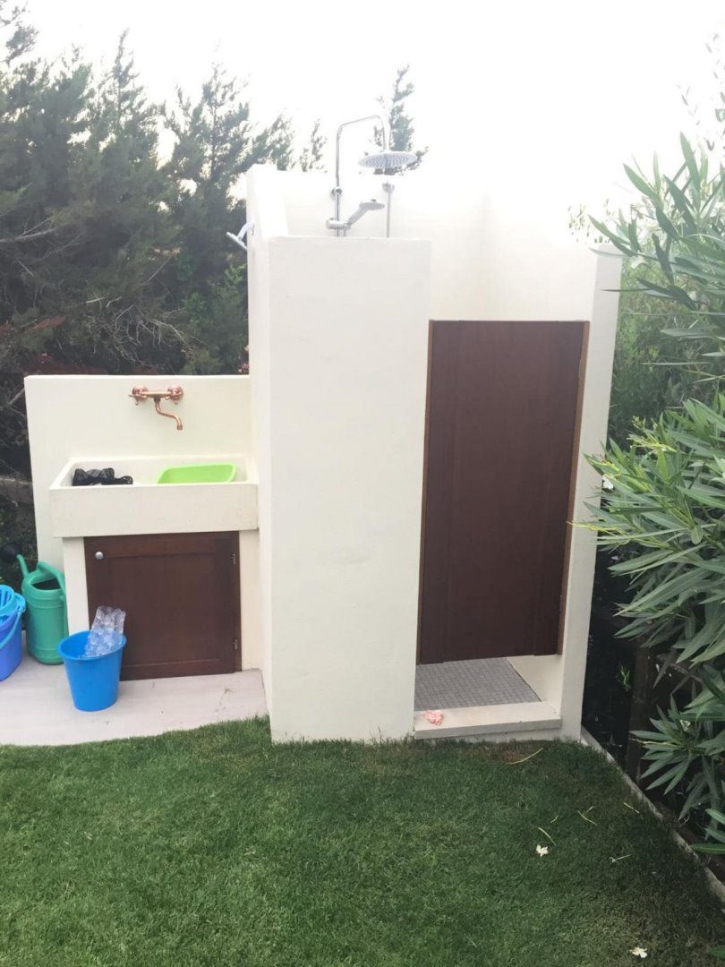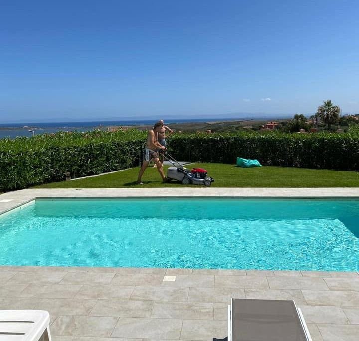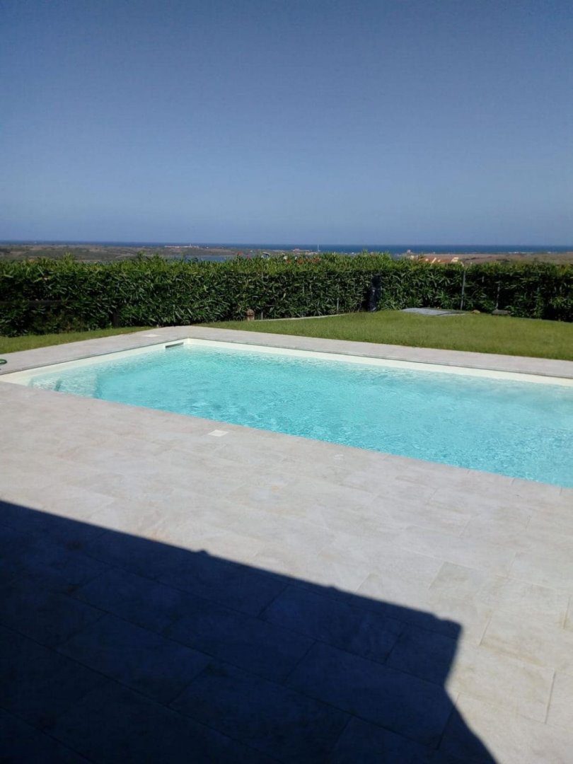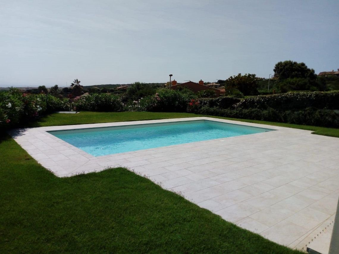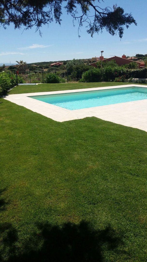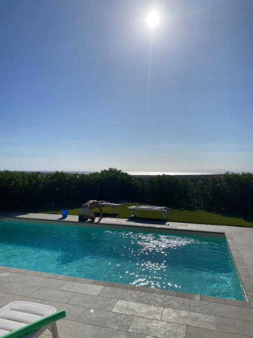 climatizzazione autonoma caldo/freddo, piscina a sale con telo rifatto nel Settembre 2024, giardino parzialmente pavimentato, doccia in muratura esterna con acqua calda e zona privacy, cancelli esterni, vani tecnici esterni, impianti elettrici ed idrici separati, giardino, piscina, e dalla veranda la panoramica arriva fino a Porto Torres.