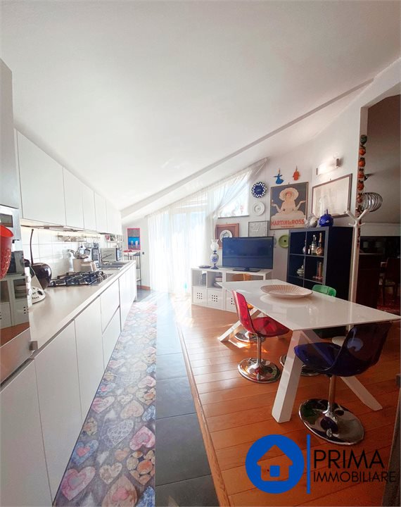 Il secondo appartamento, più ampio ed anch'esso ristrutturato, ha l'ingresso dalla stessa terrazza. Apriamo la porta e saliamo delle particolari scale in legno con ringhiera in ferro per raggiungere l'ampia e luminosa zona giorno, un ambiente inondato dalla luce, con camino e grandi finestre che accedono alle terrazze a tasca. La cucina abitabile è moderna e spaziosa. Nella zona notte ci sono due grandi camere da letto e il bagno con finestra e box doccia. Tutta l'abitazione ha delle intercapedini utilizzate con mobili si misura per un ottimale gestione degli spazi.