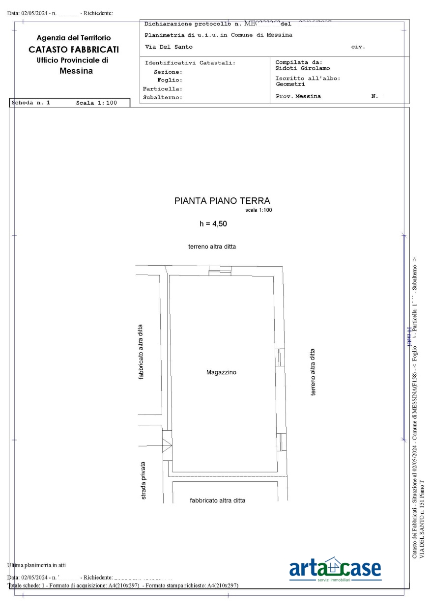 Artacase propone in vendita a Messina in via Del Santo zona Palmara locale commerciale ad uso deposito posto su strada privata e composto da un pianto terra con tetto. l locale in discreto stato di conservazione si presta a diversi usi. Per ulteriori informazioni e visite contatta 0906413192 o whatsapp 3293812425