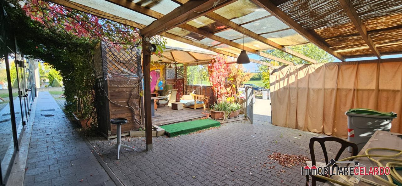 L'immobile, di recente costruzione, si estende al piano terra con resede privato mq 85 circa con annesso pergolato in legno con copertura impermeabile, fronte strada e con ampio parcheggio pubblico, ed un secondo resede privato sul retro anche se con diritto di passo di terzi.