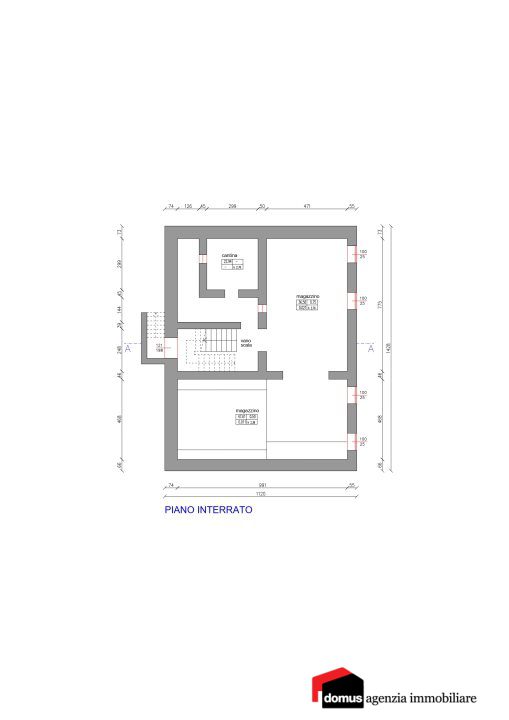 Al piano interrato trovano collocazione due magazzini di 36 mq e 47 mq oltre ad una cantina di 23 mq accessibile dalla scala comune.
