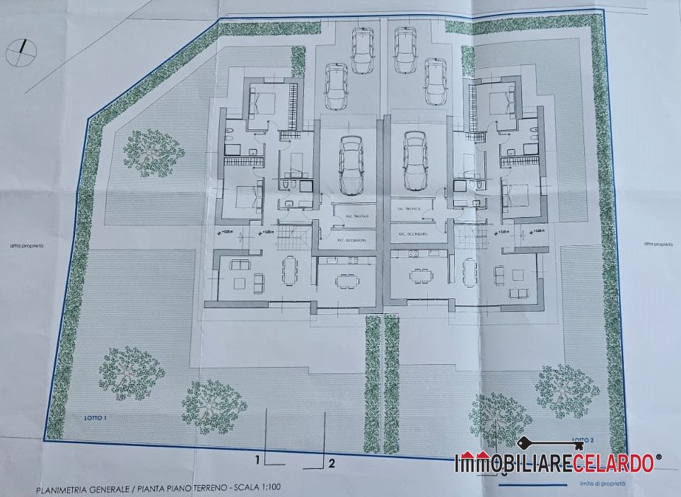 Sul terreno di 1260 mq, si può realizzare una villa singola o due ville per un totale di mq 446, di cui mq 416 al piano terra (compreso garage) e mq 30 il piano primo con 50 mq di terrazza.