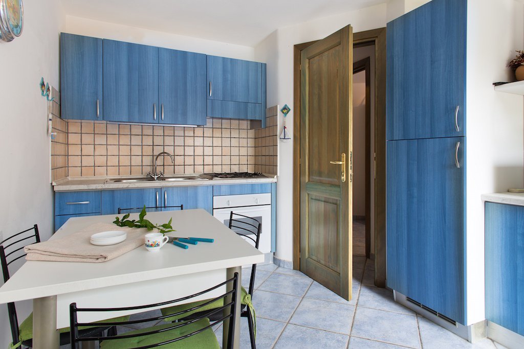 La cucina, ben attrezzata e funzionale, ha accesso diretto al giardino sul retro, che ospita un bel barbecue.