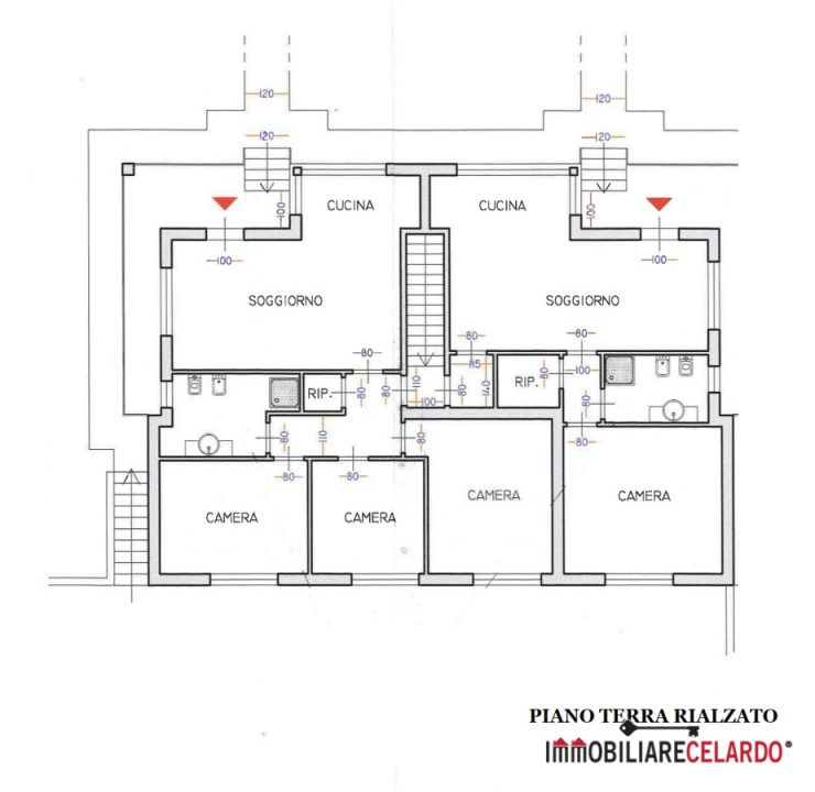 - App. A: portico d'ingresso, soggiorno ampio con angolo cottura, 3 camere, ripostiglio e bagno.