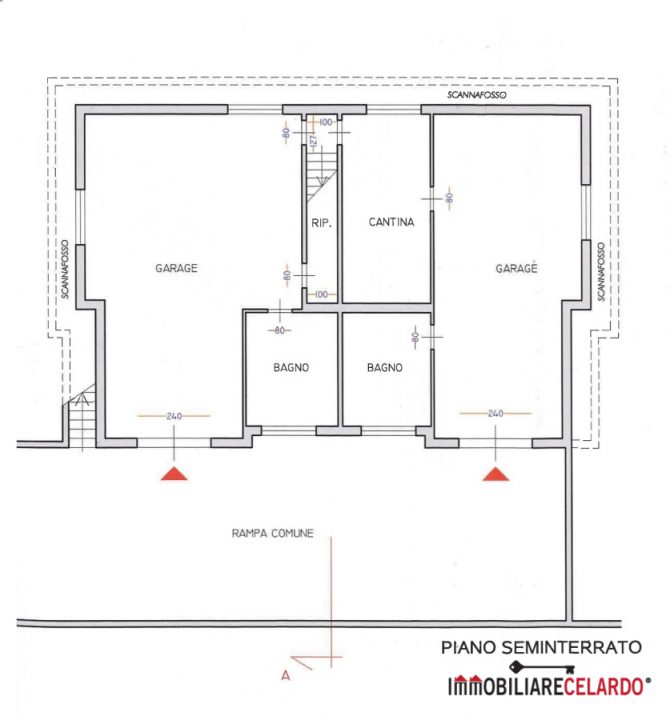 Al piano seminterrato, al quale si accede con scala interna comune ai 2 appartamenti oppure dall'esterno, sono presenti 2 grandi garage, 1 cantina e 2 bagni/lavanderia.
